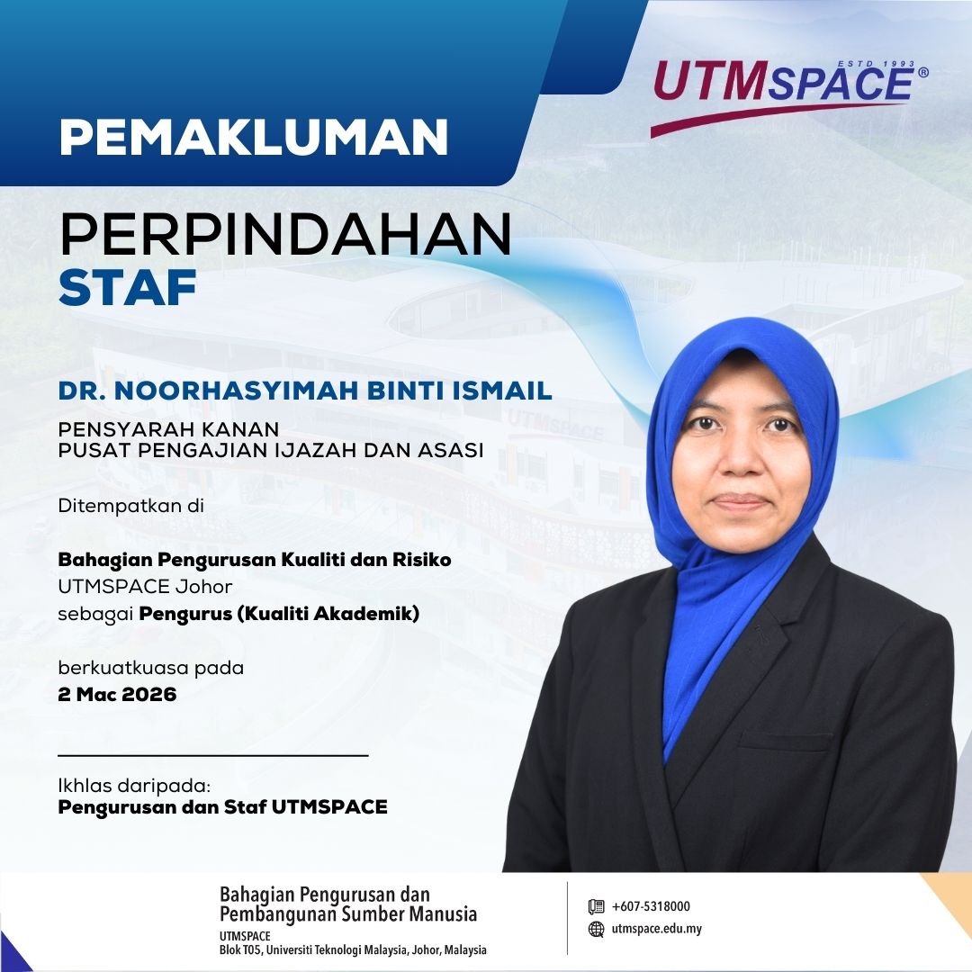 Pihak Pengurusan UTMSPACE mengucapkan selamat bertugas dan diharapkan agar beliau dapat memberikan khidmat yang cemerlang demi kemajuan UTMSPACE.