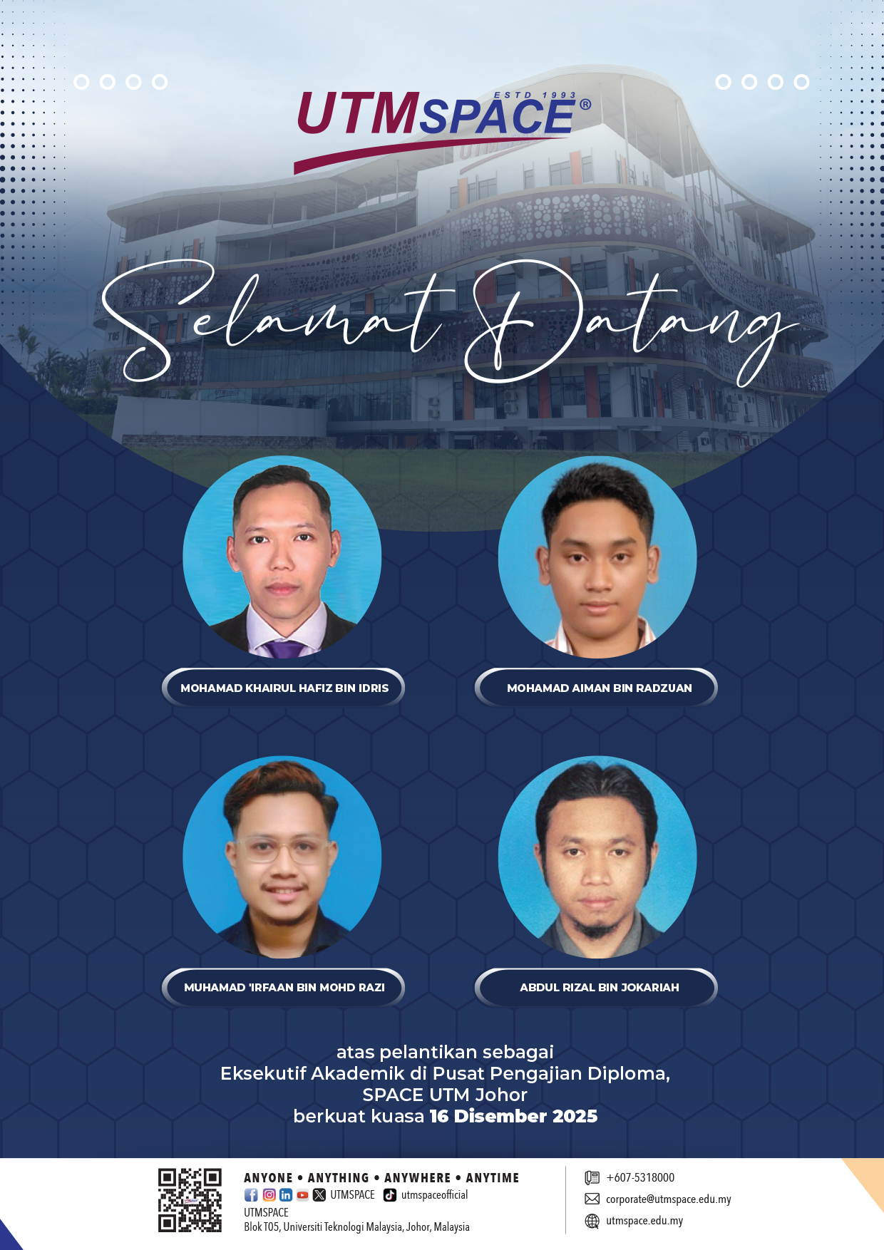 Sehubungan itu, mohon semua staf dapat memberi kerjasama yang sewajarnya kepada beliau. Pihak Pengurusan UTMSPACE mengucapkan selamat bertugas dan diharapkan agar beliau dapat memberikan khidmat yang cemerlang demi kemajuan UTMSPACE.