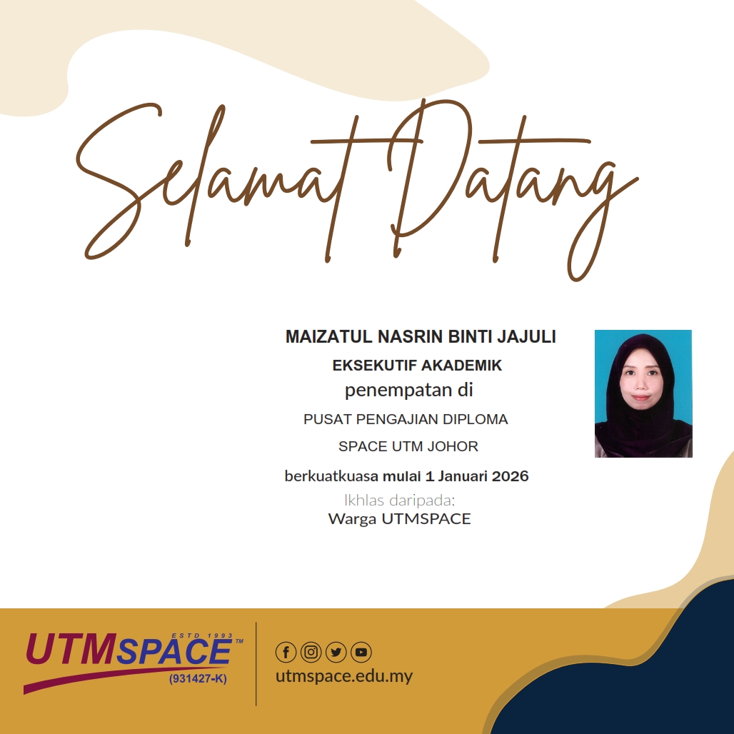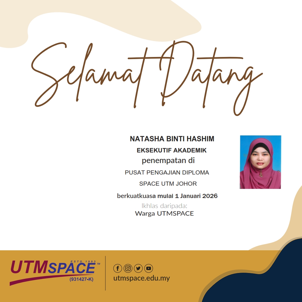 Sehubungan itu, mohon semua staf dapat memberi kerjasama yang sewajarnya kepada beliau. Pihak Pengurusan UTMSPACE mengucapkan selamat bertugas dan diharapkan agar beliau dapat memberikan khidmat yang cemerlang demi kemajuan UTMSPACE. Sekian, harap maklum dan terima kasih.