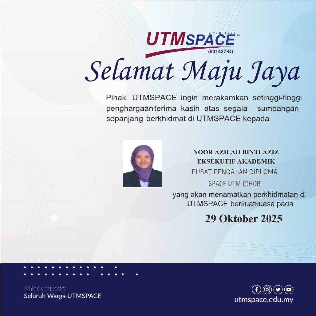 Pihak Pengurusan UTMSPACE mengucapkan ribuan terima kasih di atas sumbangan di sepanjang perkhidmatan beliau di UTMSPACE. Pihak Pengurusan UTMSPACE juga mengucapkan selamat maju jaya kepada beliau dalam apa jua bidang yang bakal diceburi.