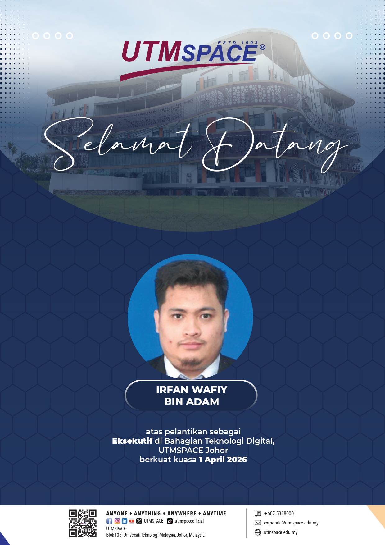 Sehubungan itu, mohon semua staf dapat memberi kerjasama yang sewajarnya kepada beliau. Pihak Pengurusan UTMSPACE mengucapkan selamat bertugas dan diharapkan agar beliau dapat memberikan khidmat yang cemerlang demi kemajuan UTMSPACE.