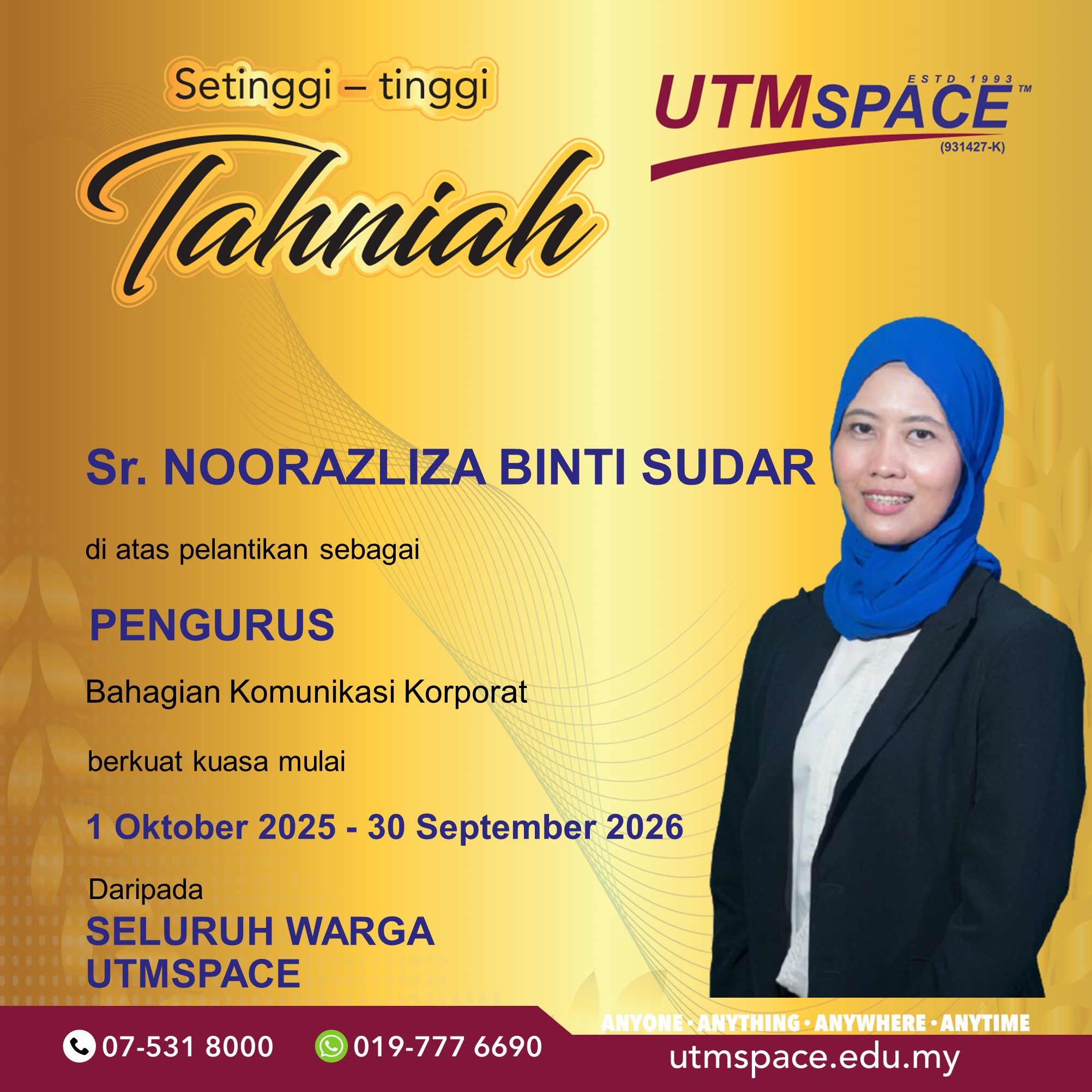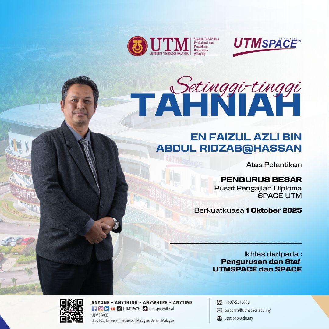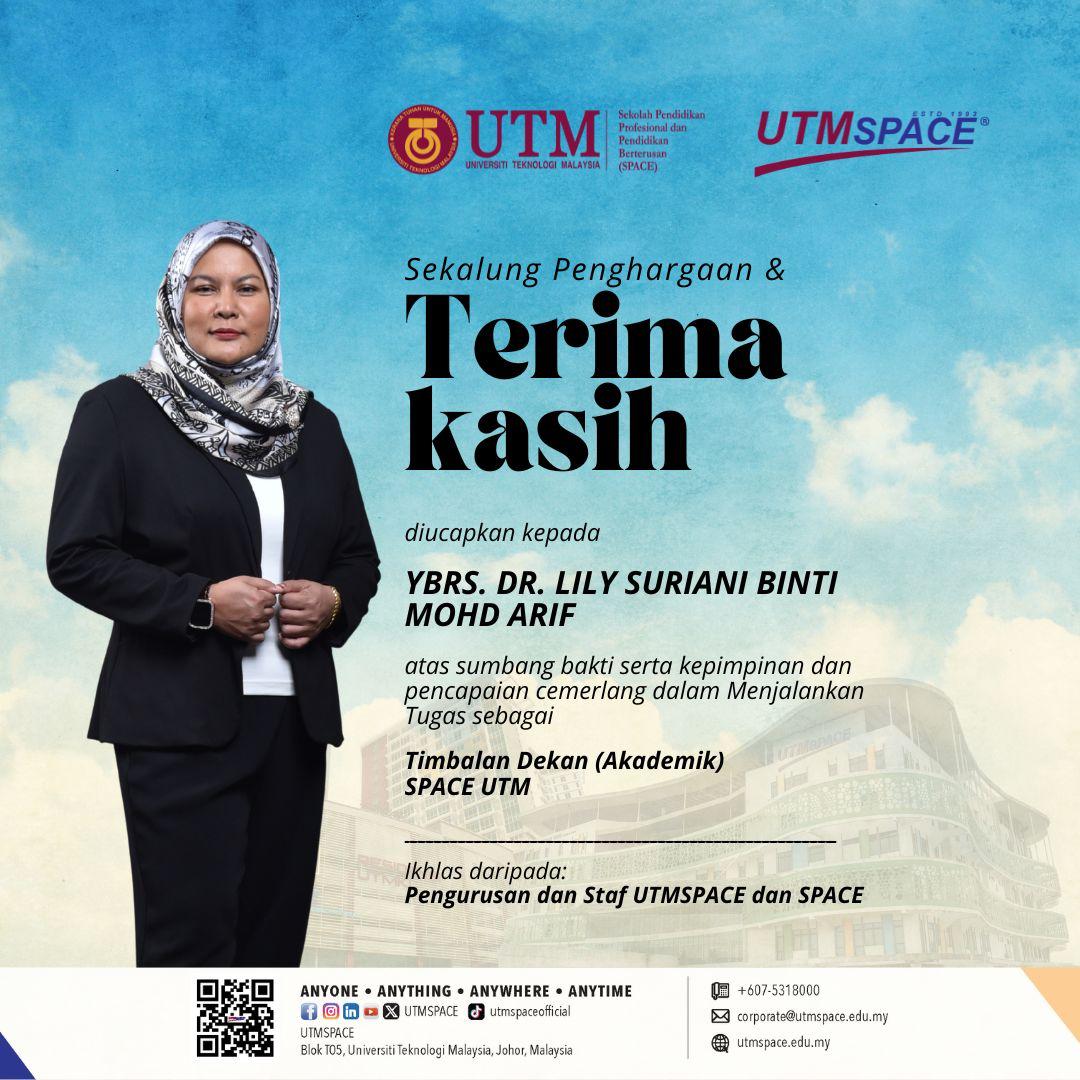 UTMSPACE ingin merakamkan setinggi-tinggi ucapan terima kasih kepada Dr. Lily Suriani binti Mohd Arif atas khidmat dan jasa bakti sepanjang berkhidmat Menjalankan Tugas sebagai Timbalan Dekan ( Akademik ) SPACE UTM yang berakhir pada 30 September 2025.