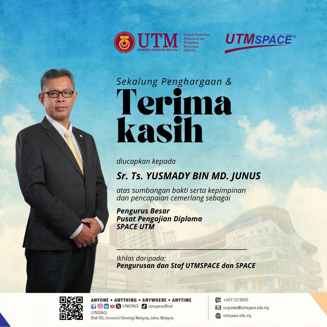 Setinggi-tinggi penghargaan buat Sr. Ts Yusmady bin Md. Junus atas kepimpinan, dedikasi serta sumbangan yang cemerlang sepanjang menjawat jawatan sebagai Pengurus Besar, Pusat Pengajian Diploma SPACE UTM yang berakhir pada 30 September 2025.