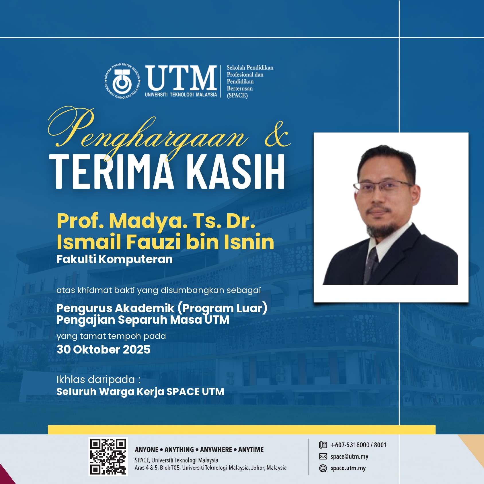 SPACE UTM ingin merakamkan setinggi-tinggi ucapan terima kasih kepada Prof. Madya. Ts. Dr. Ismail Fauzi bin Isnin atas khidmat dan jasa bakti yang disumbangkan semasa pelantikan sebagai Pengurus Akademik (Program Luar) Fakulti Komputeran, Pengajian Separuh Masa UTM yang berakhir pada 30 Oktober 2025.