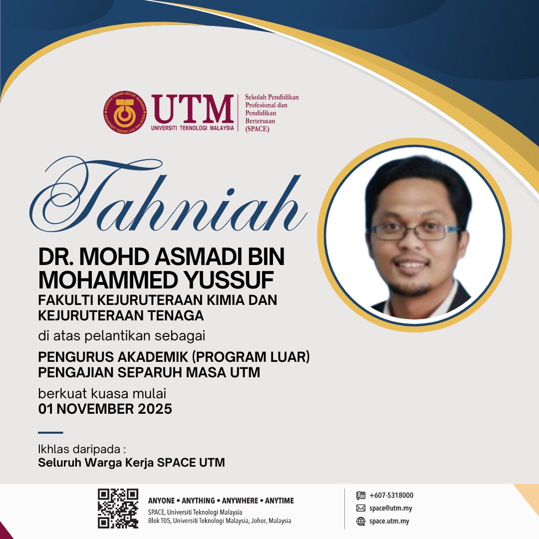 SPACE UTM ingin merakamkan setinggi-tinggi ucapan tahniah kepada Dr. Mohd Asmadi bin Mohammed Yussuf di atas pelantikan sebagai Pengurus Akademik (Program Luar) Fakulti Kejuruteraan Kimia dan Kejuruteraan Tenaga, Pengajian Separuh Masa UTM berkuatkuasa mulai 1 November 2025.