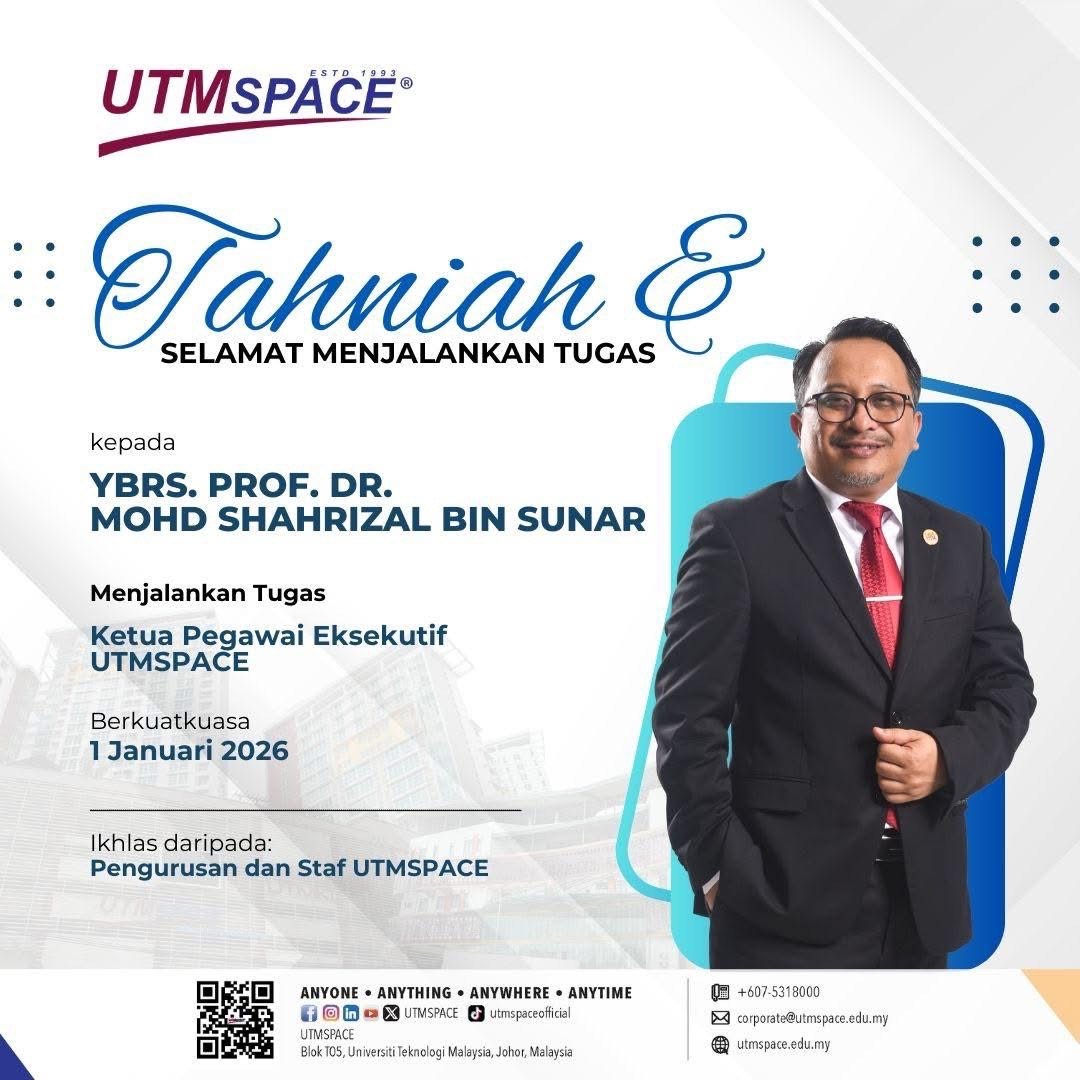 Assalammualaikum w.b.t Sukacita dimaklumkan bahawa Cik Adilah binti Darsani telah berpindah dari Bahagian Hal Ehwal Antarabangsa , UTMSPACE Johor ke Bahagian Pengurusan Penyelidikan dan Sumber Pembelajaran , UTMSPACE Johor berkuatkuasa mulai 1 Januari 2026. Pihak Pengurusan UTMSPACE mengucapkan selamat bertugas dan diharapkan agar beliau dapat memberikan khidmat yang cemerlang demi kemajuan UTMSPACE.