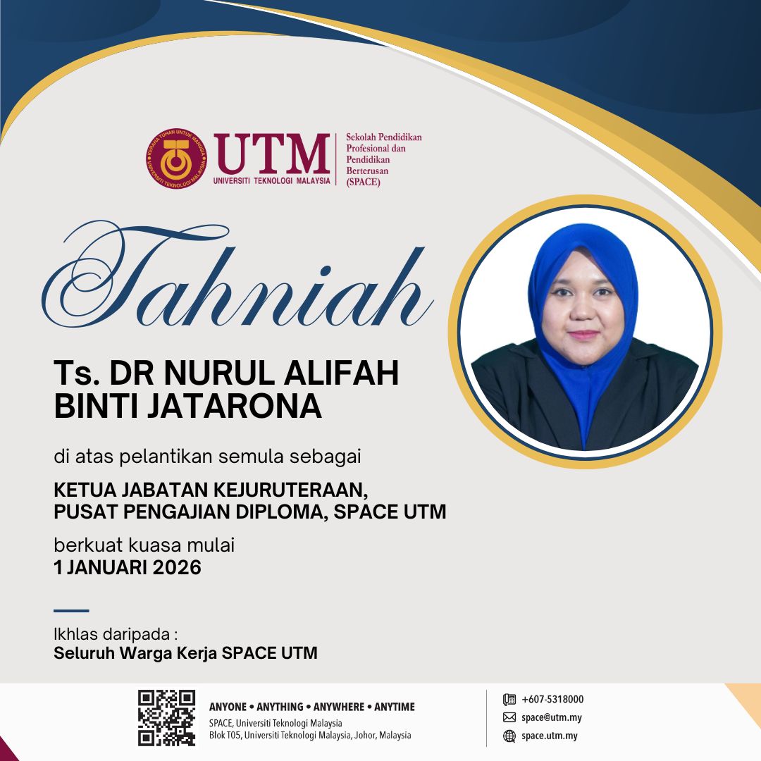 Warga SPACE UTM ingin merakamkan setinggi-tinggi ucapan tahniah kepada Ts. Dr. Nurul Alifah binti Jatarona di atas pelantikan semula sebagai Ketua Jabatan Kejuruteraan, Pusat Pengajian Diploma SPACE UTM bermula 1 Januari 2026. Semoga Tuan dapat menyumbang idea serta tenaga dengan penuh dedikasi demi memajukan SPACE UTM. Tahniah diucapkan.