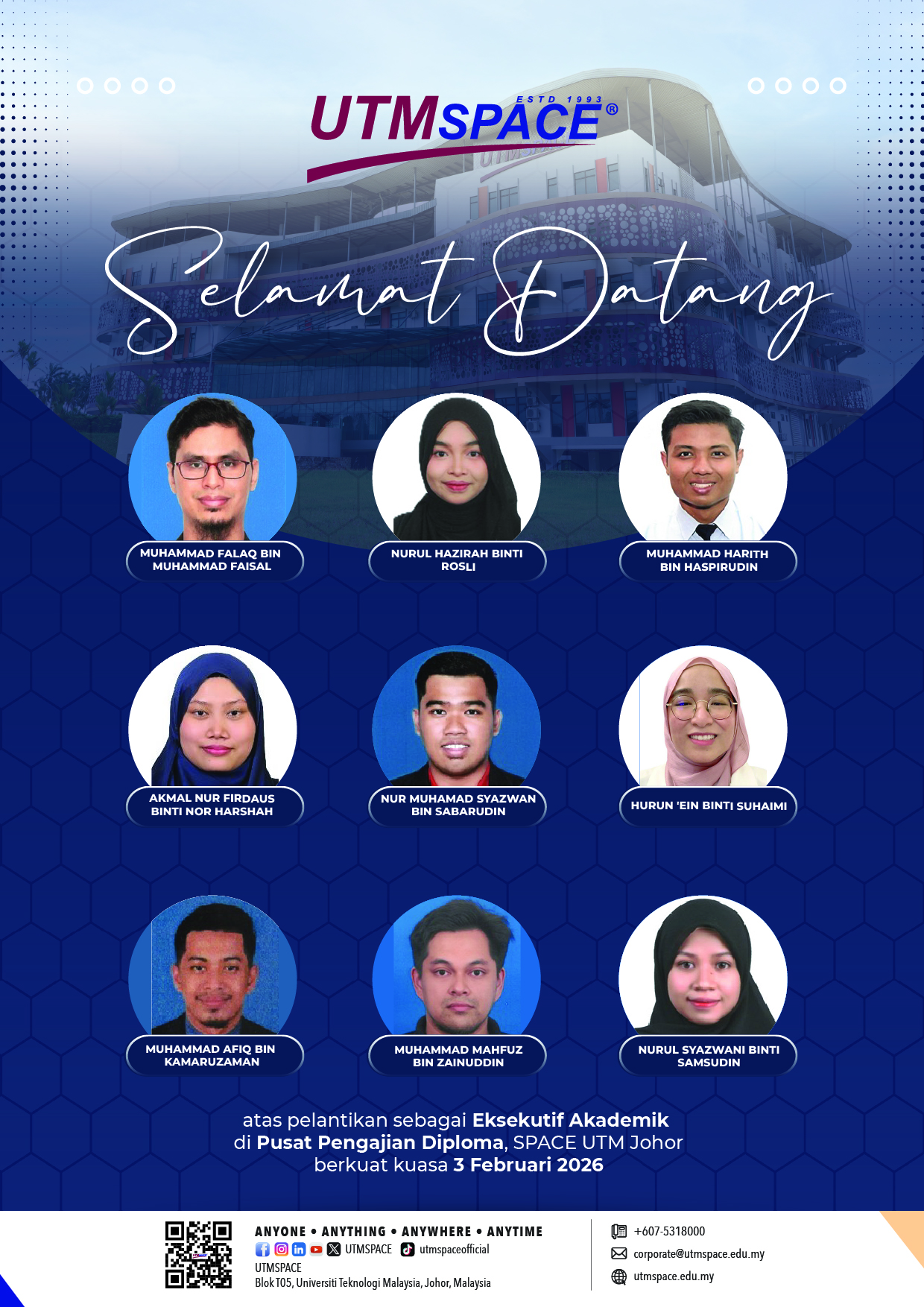 Sukacita dimaklumkan bahawa Encik Norafindy bin Nordin telah dilantik sebagai Eksekutif Akademik, Pusat Pengajian Diploma, SPACE UTM Johor berkuatkuasa pada 15 Januari 2026.