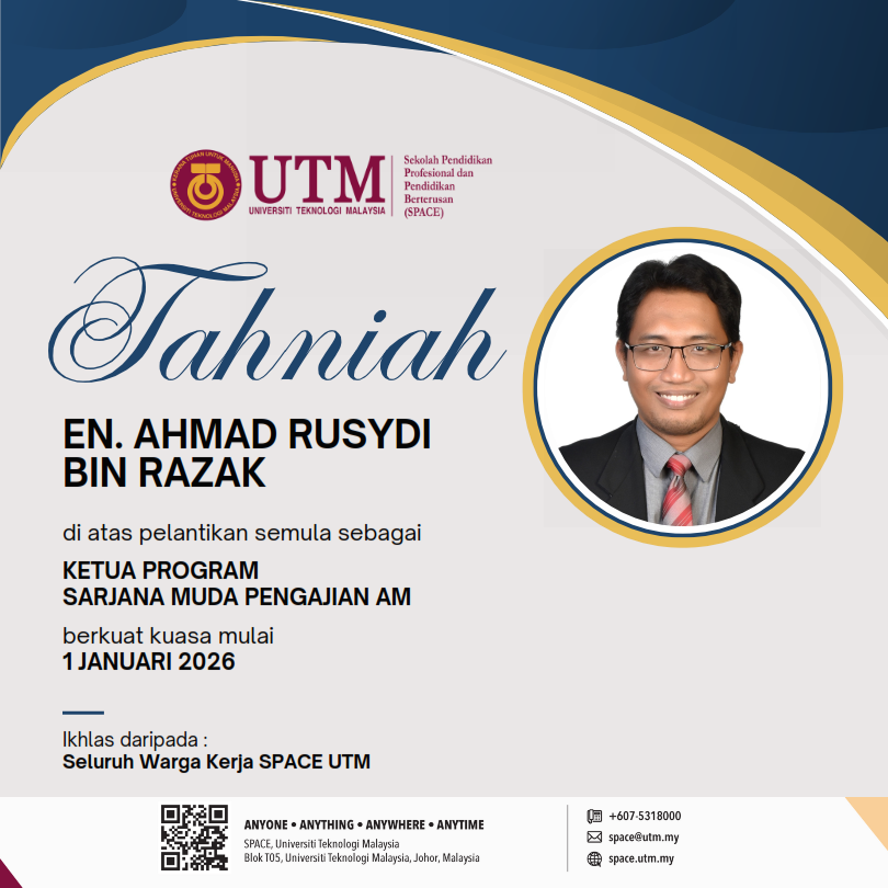 Warga SPACE UTM ingin merakamkan setinggi-tinggi ucapan tahniah kepada En. Ahmad Rusydi bin Razak di atas pelantikan sebagai Ketua Program Sarjana Muda Pengajian AM, Pusat Pengajian Ijazah dan Asasi SPACE UTM bermula 1 Januari 2026. Semoga Tuan dapat menyumbang idea serta tenaga dengan penuh dedikasi demi memajukan SPACE UTM. Tahniah diucapkan.