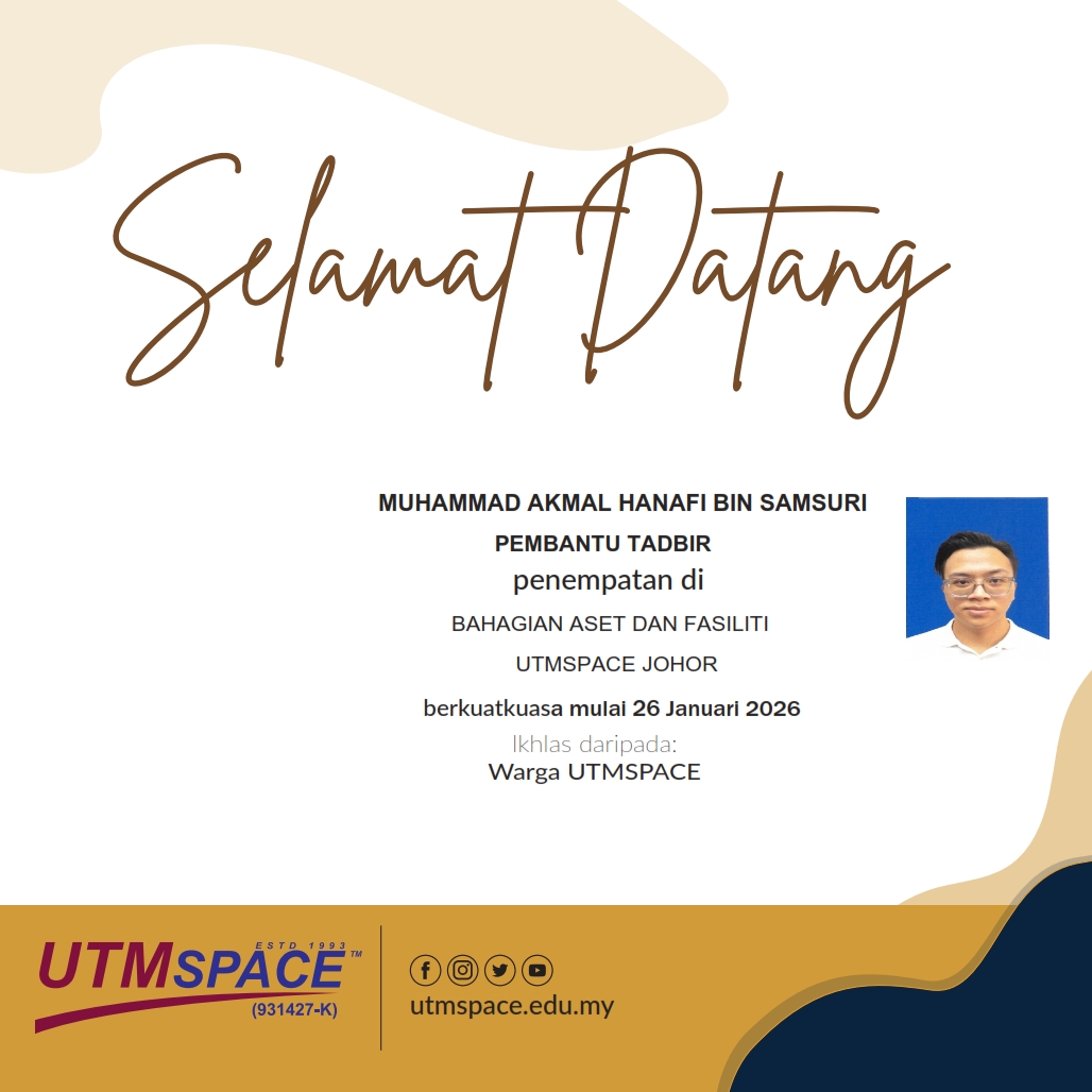 Sukacita dimaklumkan bahawa Encik Muhammad Akmal Hanafi bin Samsuri telah dilantik sebagai Pembantu Tadbir, Bahagian Aset dan Fasiliti, UTMSPACE Johor berkuatkuasa pada 26 Januari 2026.