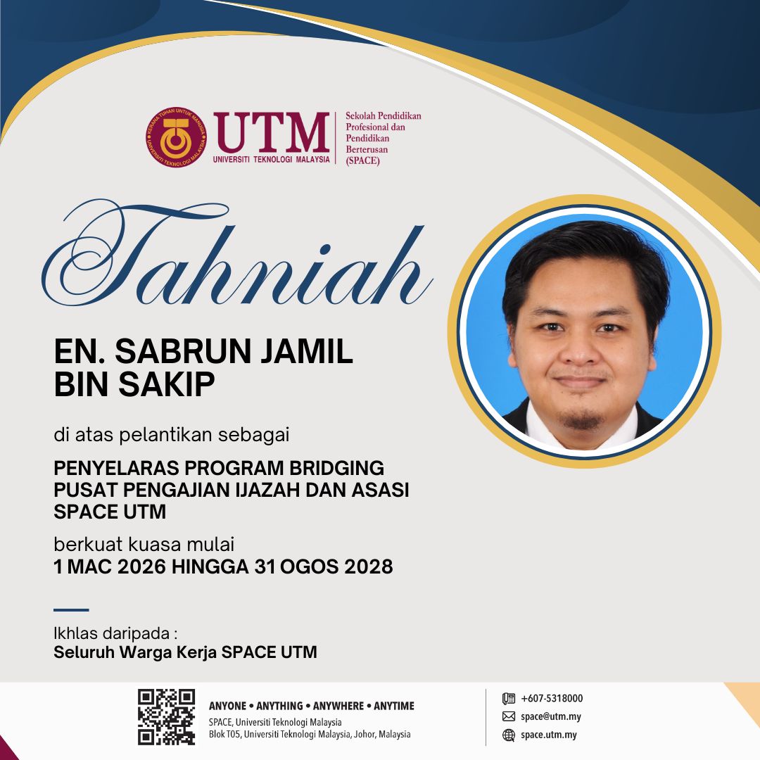 Warga SPACE UTM ingin merakamkan setinggi-tinggi ucapan tahniah kepada Encik Sabrun Jamil bin Sakip di atas pelantikan sebagai Penyelaras Program Bridging, Pusat Pengajian Ijazah dan Asasi SPACE UTM bermula 1 Mac 2026. Semoga Tuan dapat menyumbang idea serta tenaga dengan penuh dedikasi demi memajukan SPACE UTM. Tahniah diucapkan.